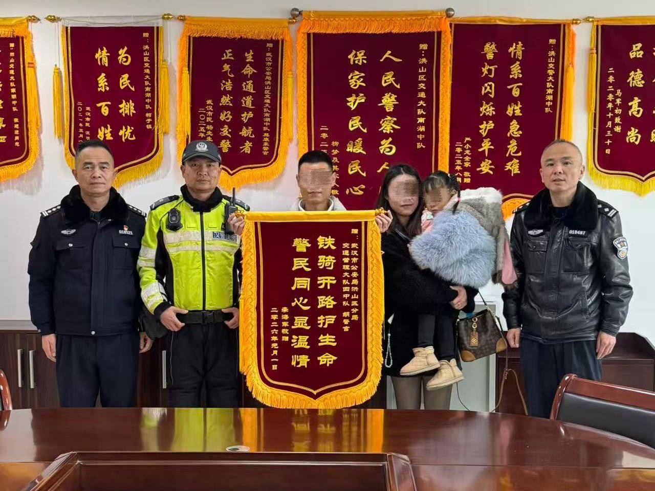 湖北日报讯(记者 张景恒 黄一燕 通讯员杨巧玲)1月6日上午,武汉市公安局洪山区分局交通管理大队办公室热情欢迎。李先生和他的三位家属将一面写有“骑兵铺路拯救生命,警民同心送温暖”的鲜红横幅,郑重地交给了快手团队成员胡雷。这份真挚的感谢背后,是元旦一场与时间赛跑的紧急救援行动。下午 1:45 1月1日,洪山区交管大队四连救生队队员胡磊接到指挥中心命令,一名4岁男孩突然出现高烧、抽搐,生命垂危。家属李先生从江夏赶来,不得不紧急陪孩子前往武汉儿童医院。香港路治疗。胡雷接到电话后,立即联系了打电话的李某,询问李某所在位置、车牌号码、车辆特征。我发现儿子发高烧42度,而且由于过年假期,路上交通堵塞。李先生的定点医院距离这里有20多公里,开车至少需要一个小时。时间至关重要,每一秒对于您孩子的生命和安全都很重要。胡雷凭借对当地路况和医疗资源的熟悉,强烈建议李某改道前往附近的湖北省妇幼保健院急救。 “别挂电话,直走过珞石路立交桥,我在前面的桥上等你。”在征得家人同意后,胡磊赶紧调整车队路线,“跟着我的摩托车,走右车道,注意安全。”“这条路是一条路。”有点拥挤。不用担心。 ” “在前面的路口左转。护送过程中,胡雷不断与李某交谈,耐心引导救援车跟随领头警车。下午2时02分,李某的车安全抵达湖北省妇幼保健院。为了尽快救治孩子,胡雷将家里的孩子抱上车,送至急诊室,直到看到医护人员正在抢救孩子,他才离开。“谢谢胡警官。孩子按时送到了医院,现在已经完全健康了!”事后,李先生难掩感激之情。为了表达这份深深的感激之情,他和家人专门制作了横幅,拜访了红山交警,表达了诚挚的谢意。