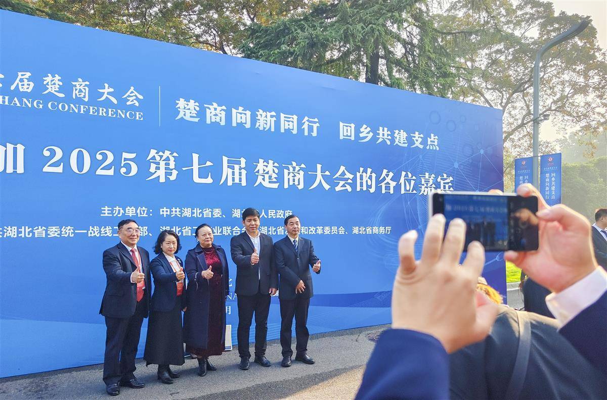 10月29日,第七届楚商大会在武汉开幕。四川省工商会会长、新希望集团董事长刘永好致辞,号召川楚商共建美好家乡。 (供图:湖北日报全媒体记者 柯浩 刘博文)10月29日,出席会议的楚企业代表在会场外合影留念。
